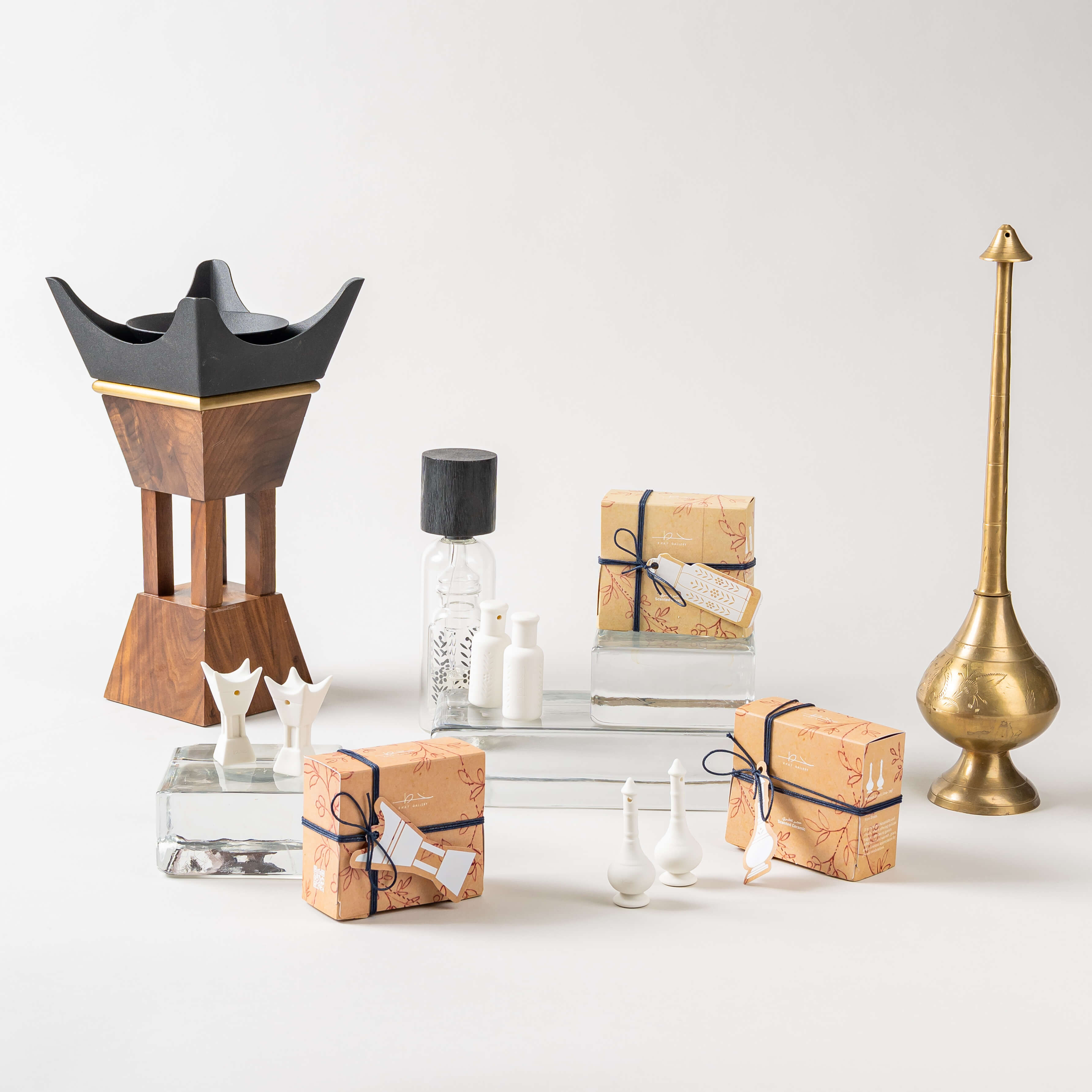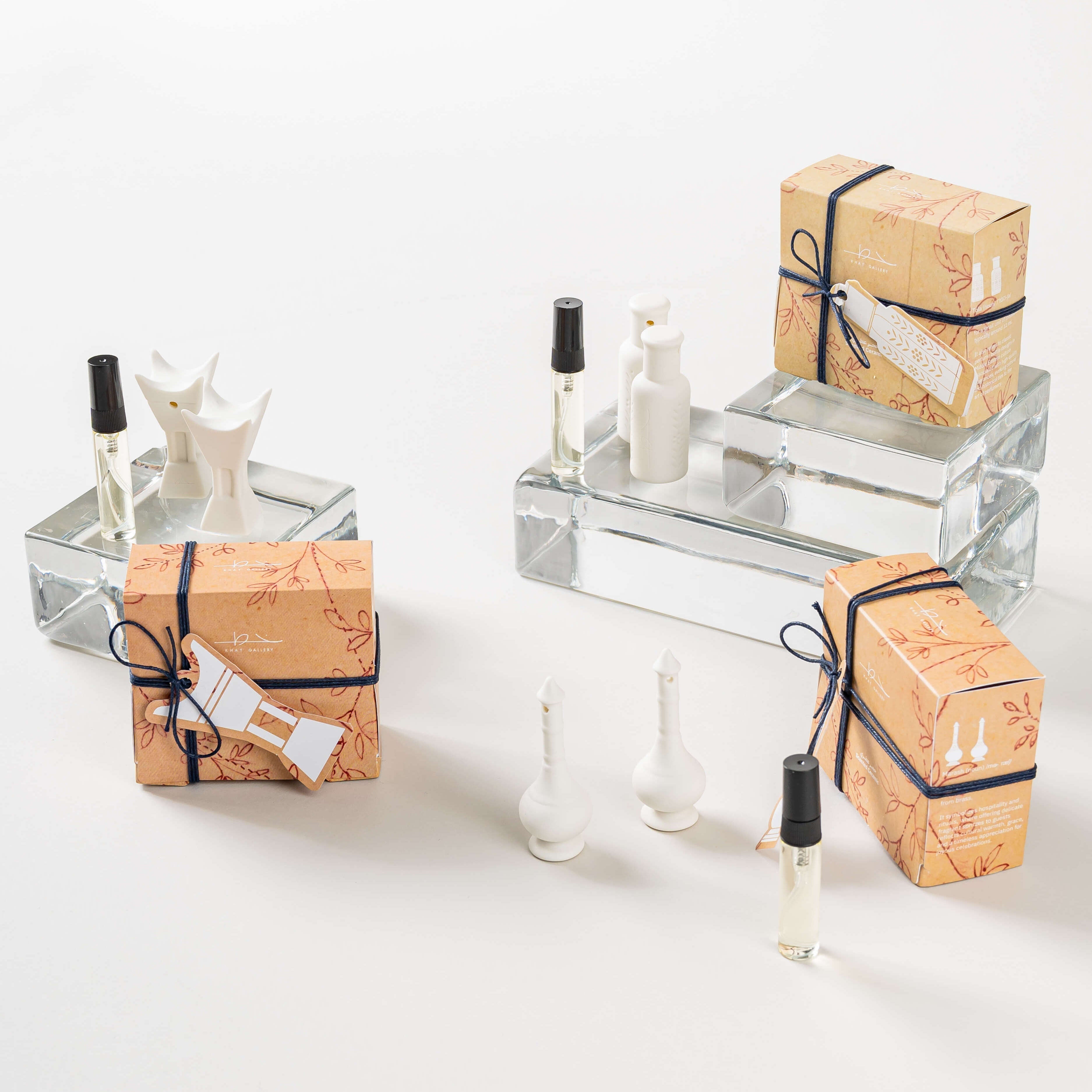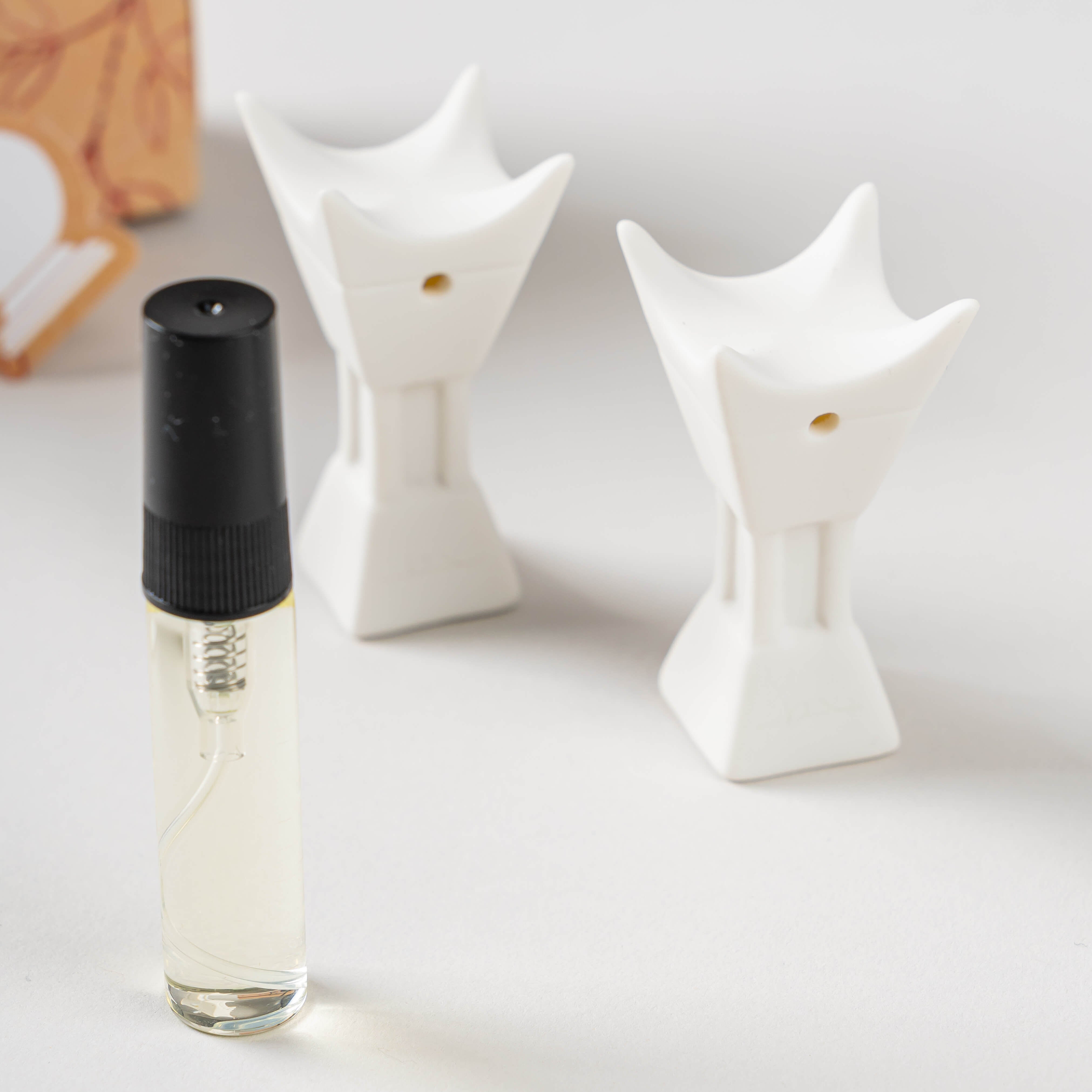 Two pieces of sculpted white ceramic shaped like traditional Mubkhar, paired with a 5ml fragrance and a ribbon, designed for scenting closets and cars.
