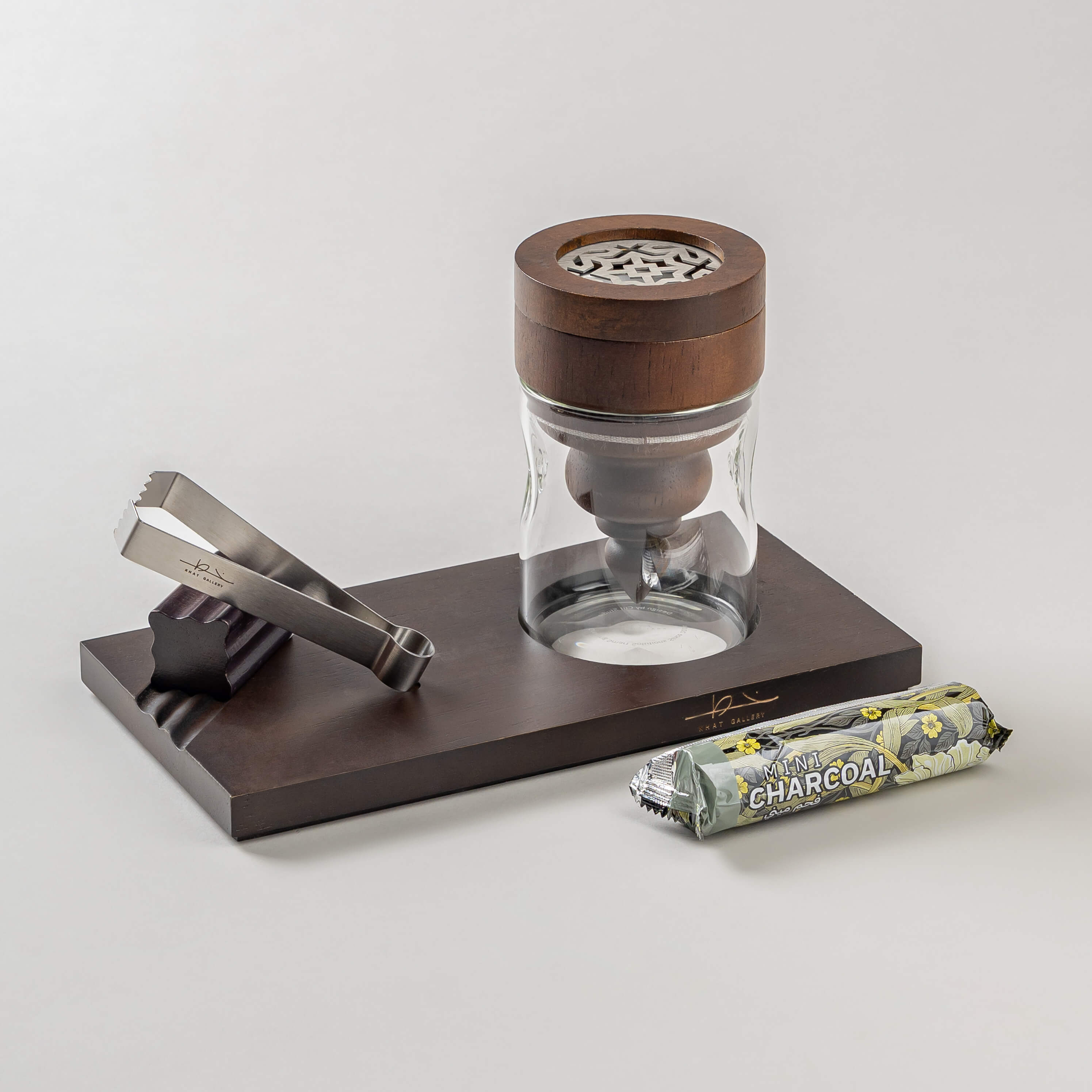A wooden tray includes the new colors of Aknaf Mubkhar, 10 Mini Charcoal pcs and Tong