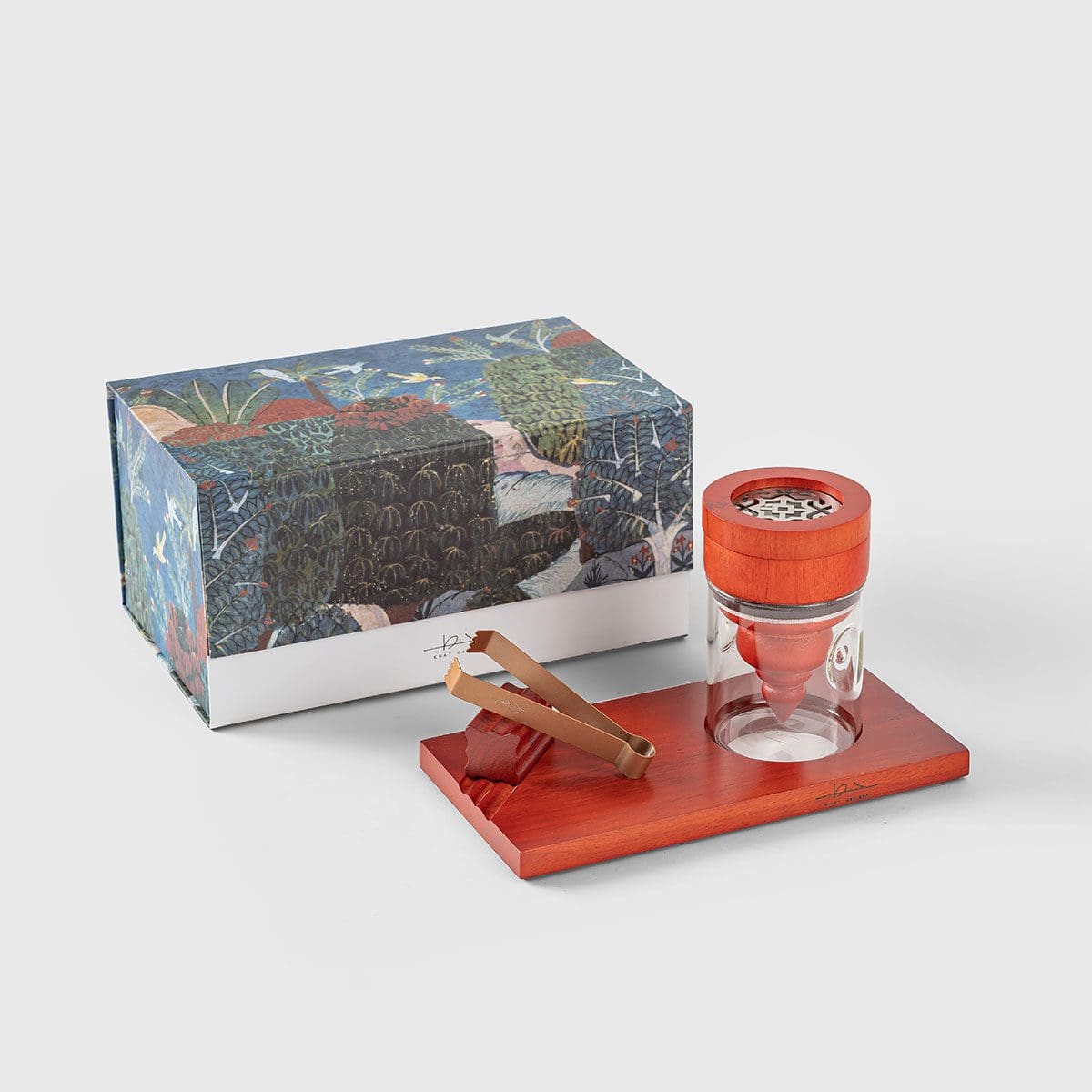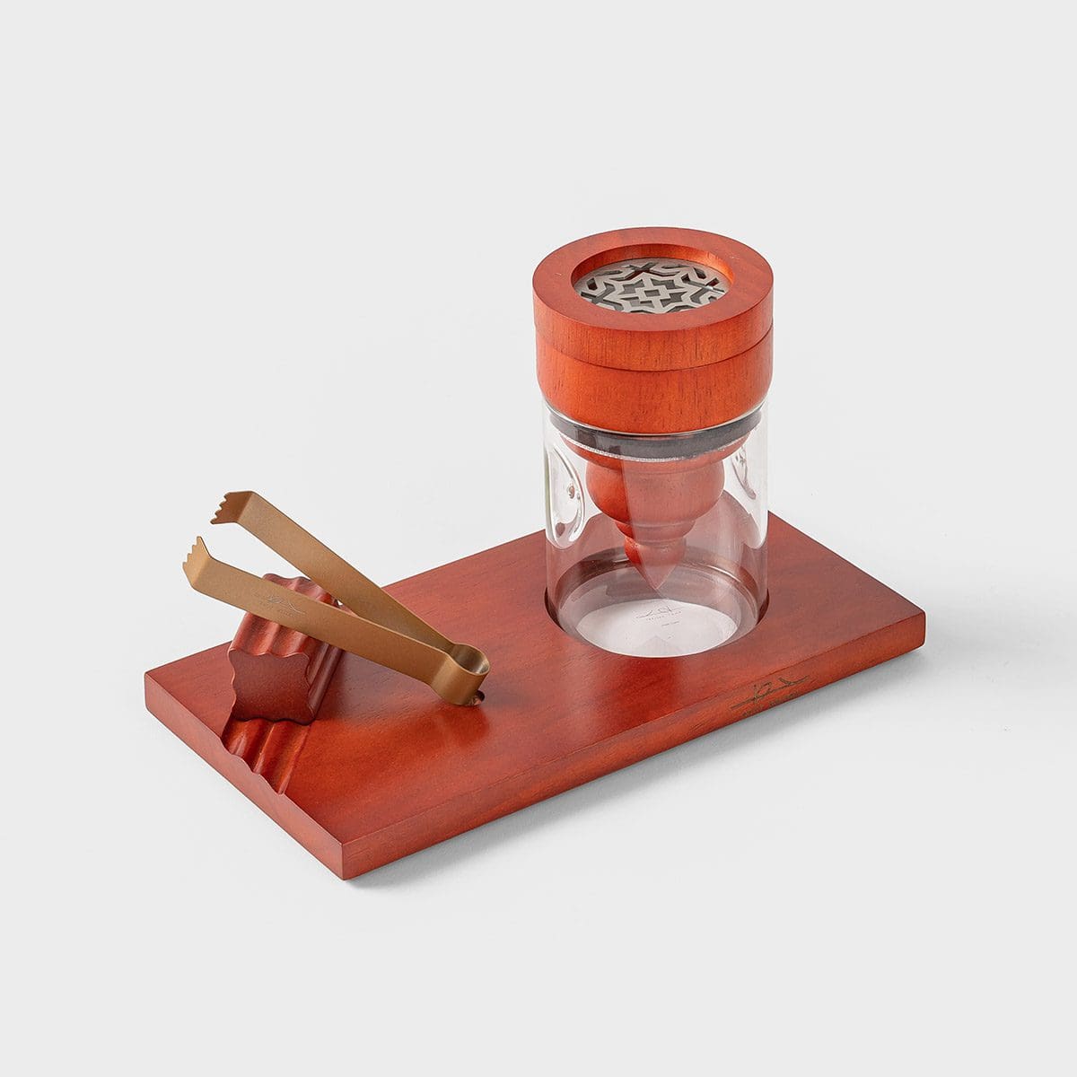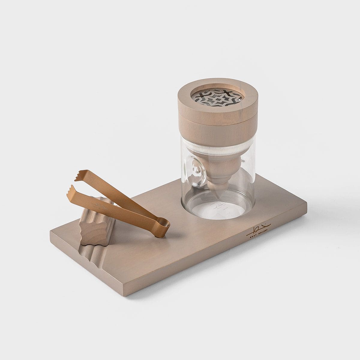 A wooden tray includes the new colors of Aknaf Mubkhar, 10 Mini Charcoal pcs and Tong