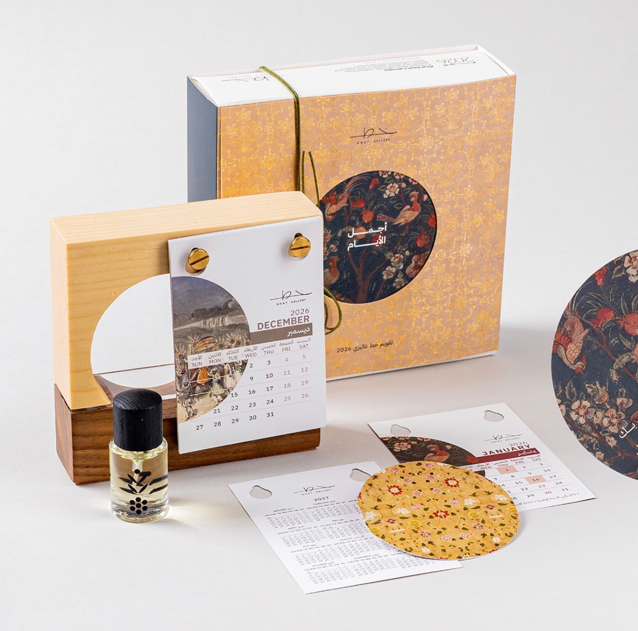 A premium 2026 Desk Calendar by Khat Gallery, crafted to combine elegant design, fine fragrance, and artistic details.