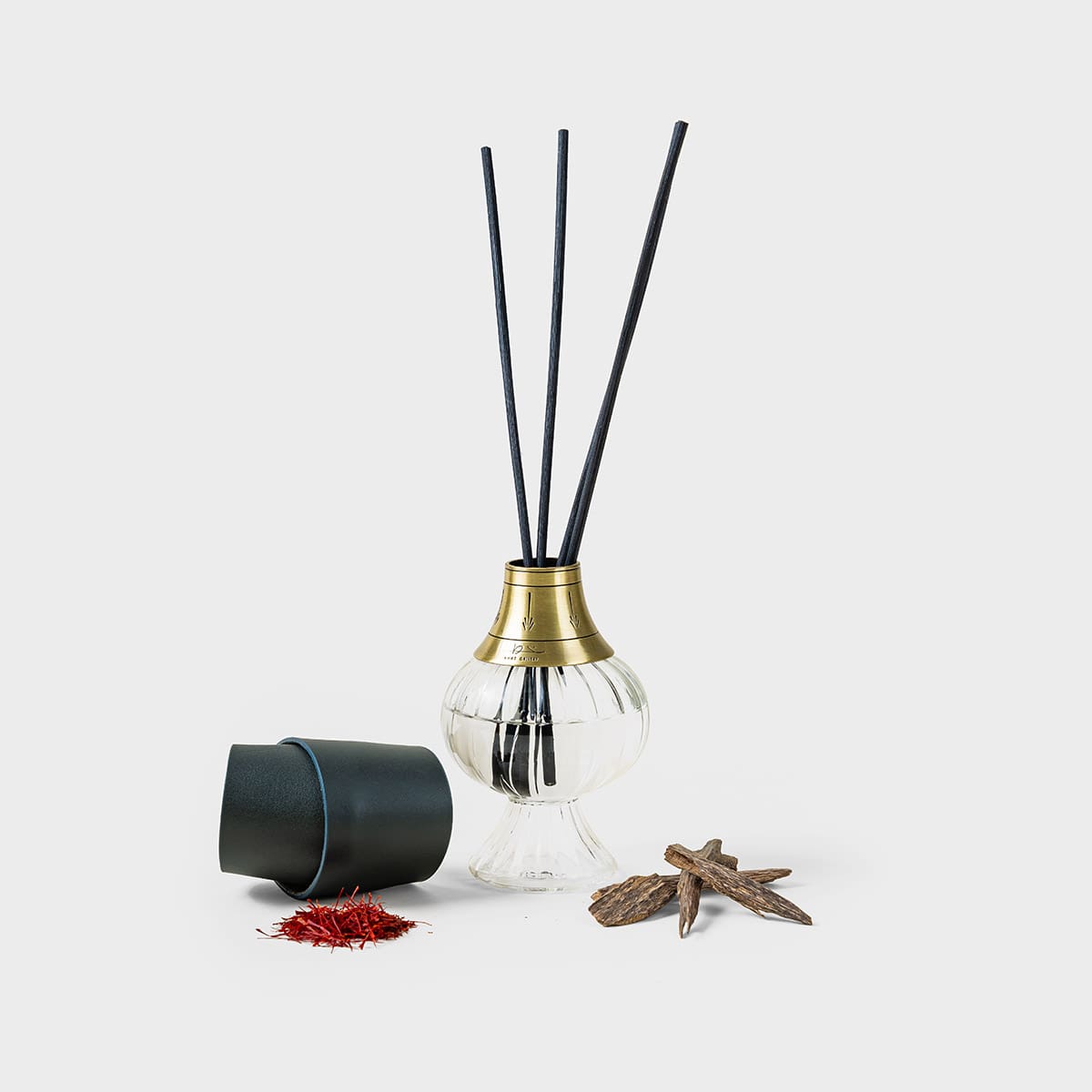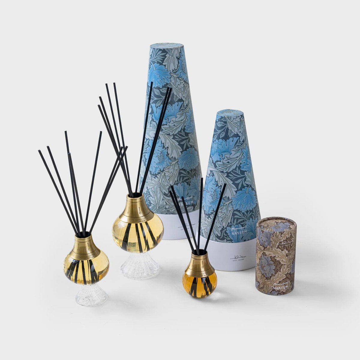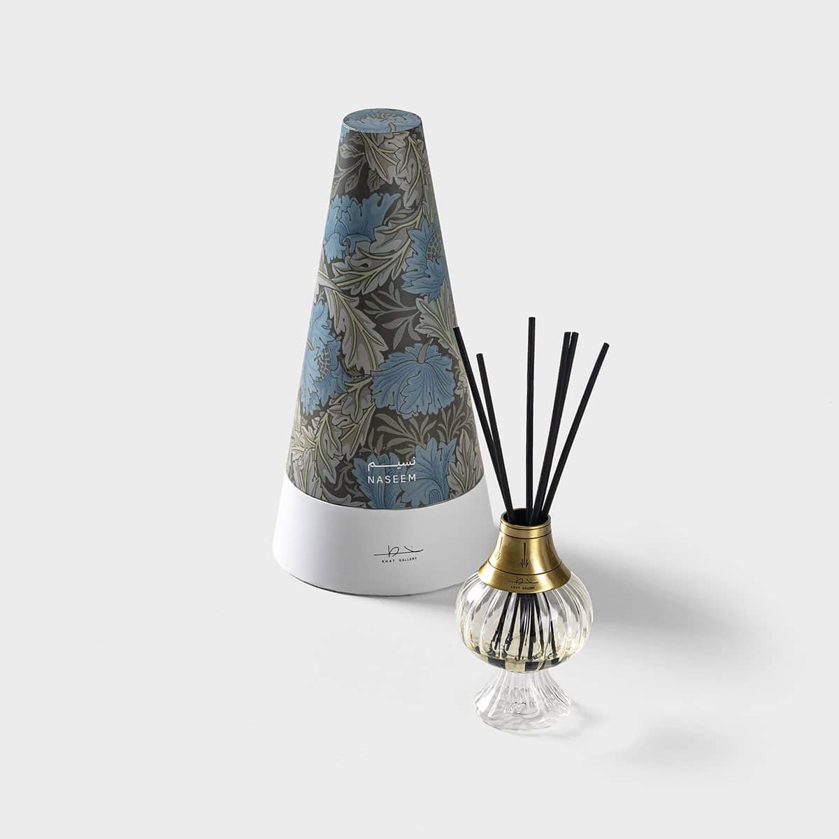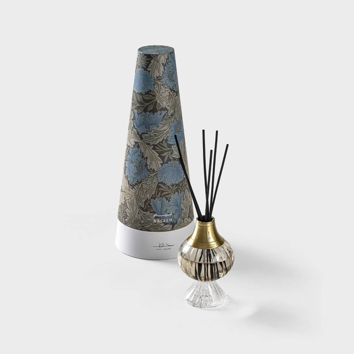 Naseem Diffuser design is inspired by traditional Kuwaiti and Arab heritage, featuring our "Sama" scent with notes of passion fruit, saffron, white rose, patchouli, leather, amber, vanilla, and oud.