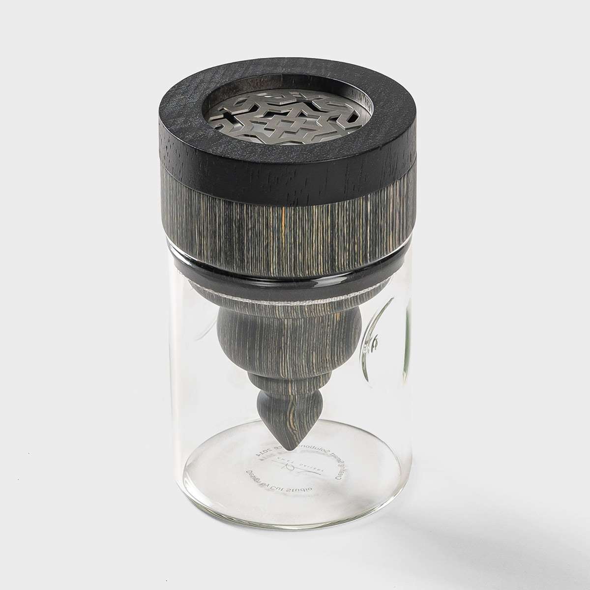 A unique colorful wooden mubkhar with glass base for bukhor storage!